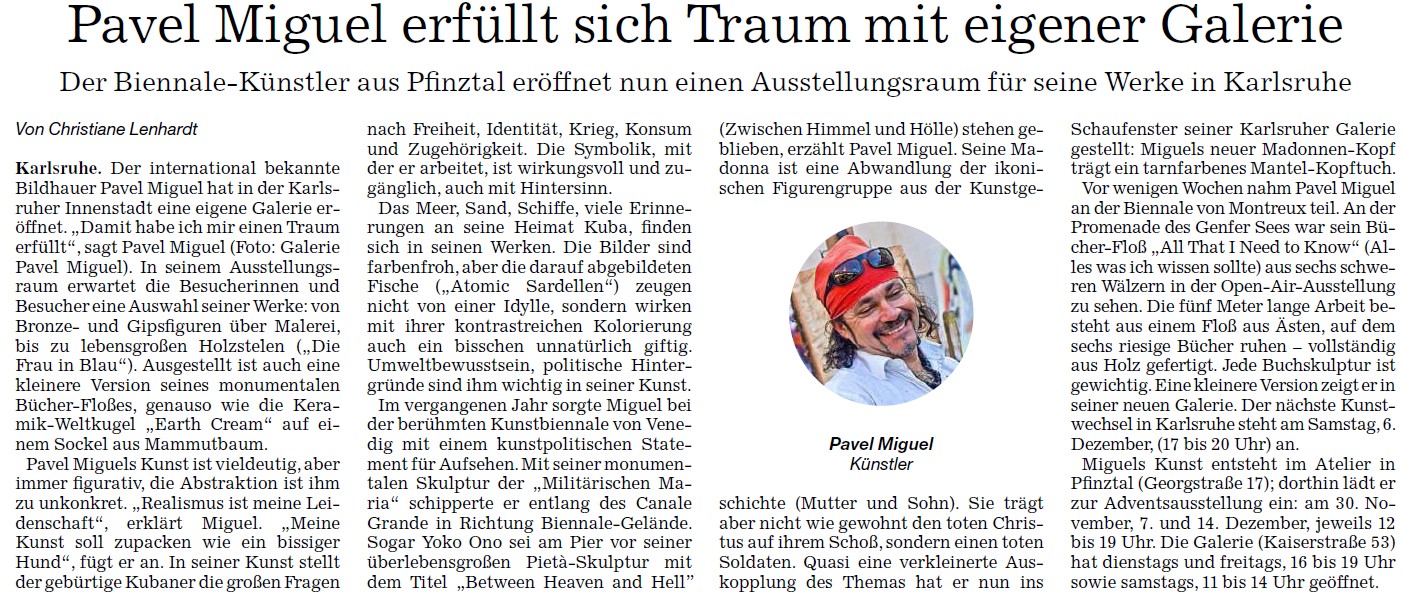 **Karlsruhe.** Der international bekannte Bildhauer Pavel Miguel hat in der Karlsruher Innenstadt eine eigene Galerie eröffnet. „Damit habe ich mir einen Traum erfüllt“, sagt Pavel Miguel (Foto: Galerie Pavel Miguel). In seinem Ausstellungsraum erwartet die Besucherinnen und Besucher eine Auswahl seiner Werke: von Bronze- und Gipsfiguren über Malerei, bis zu lebensgroßen Holzstelen („Die Frau in Blau“). Ausgestellt ist auch eine kleinere Version seines monumentalen Bücher-Floßes, genauso wie die Keramik-Weltkugel „Earth Cream“ auf einem Sockel aus Mammutbaum.